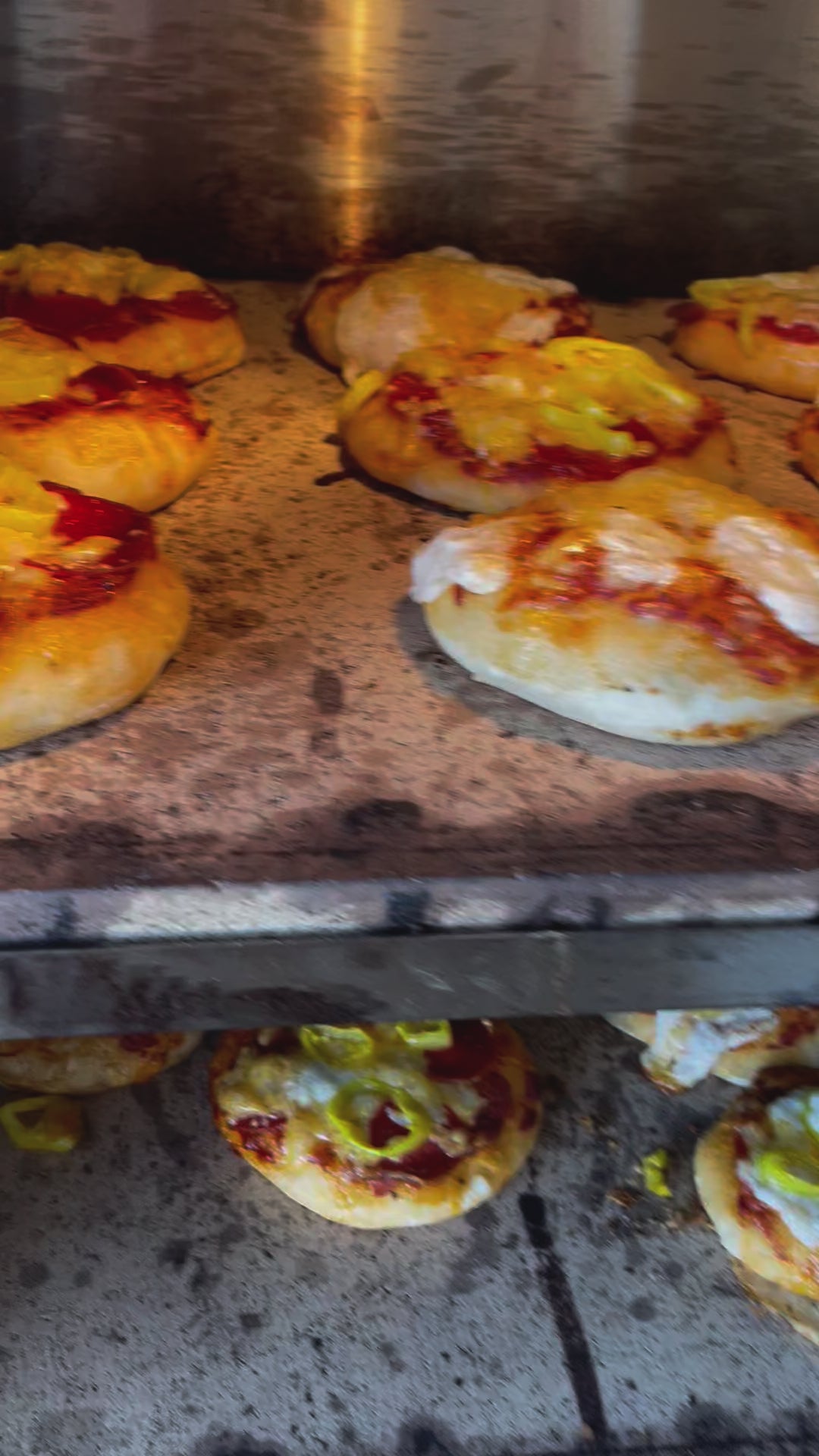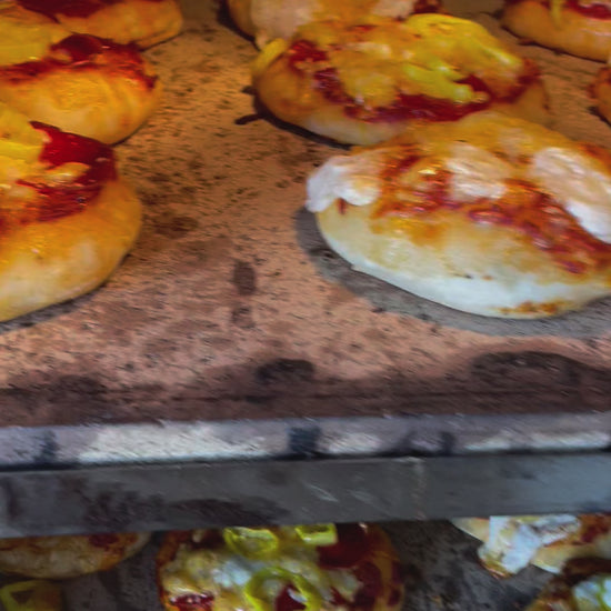 The 4 Mini Pizzas are made with TGB Sourdough in a stone oven. The dough is like a pillow for the delicious pizza sauce from TheSaucySub. They are topped with Pepperoni, Banana Pepperoni Rings, and really good cheese.