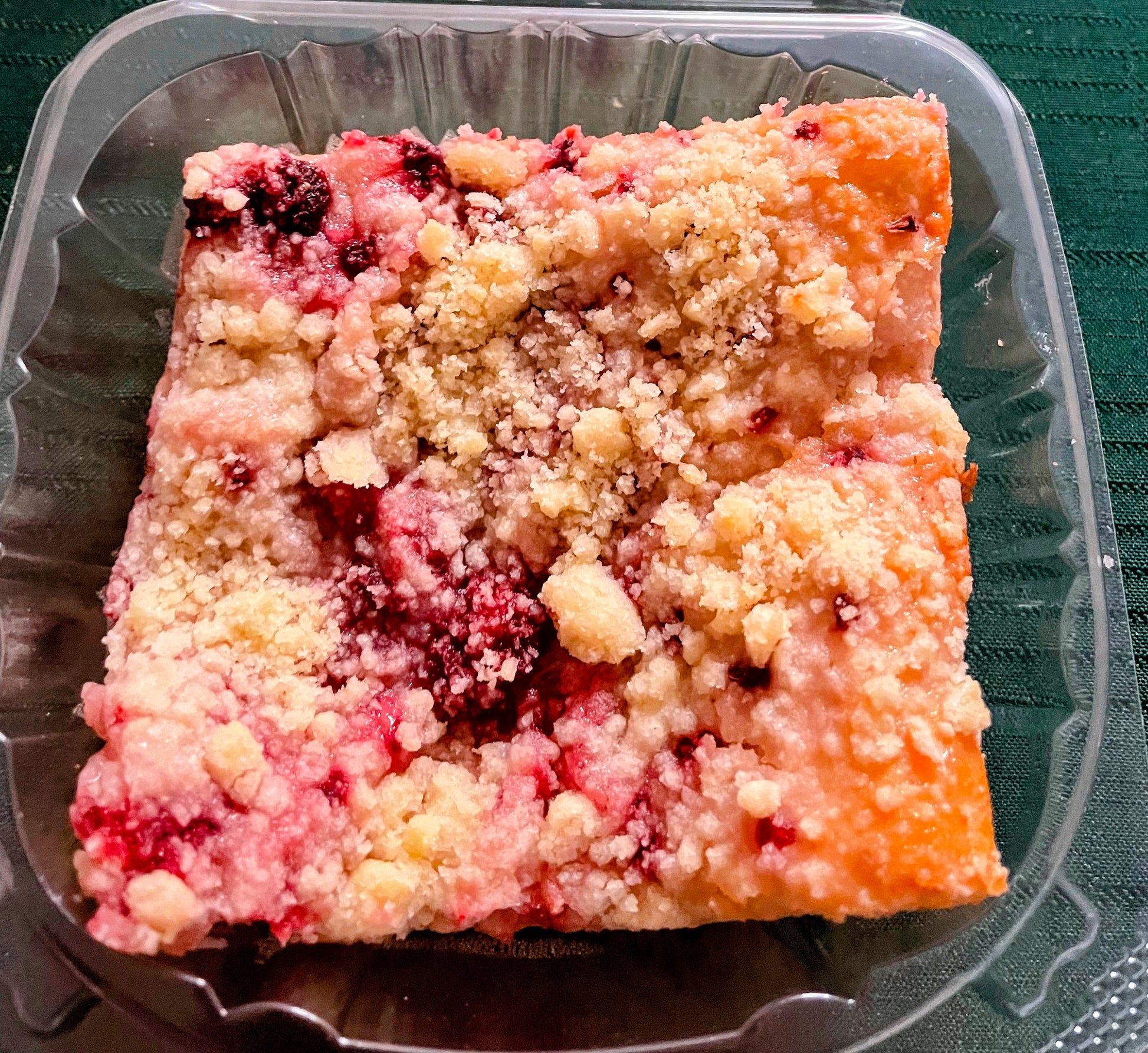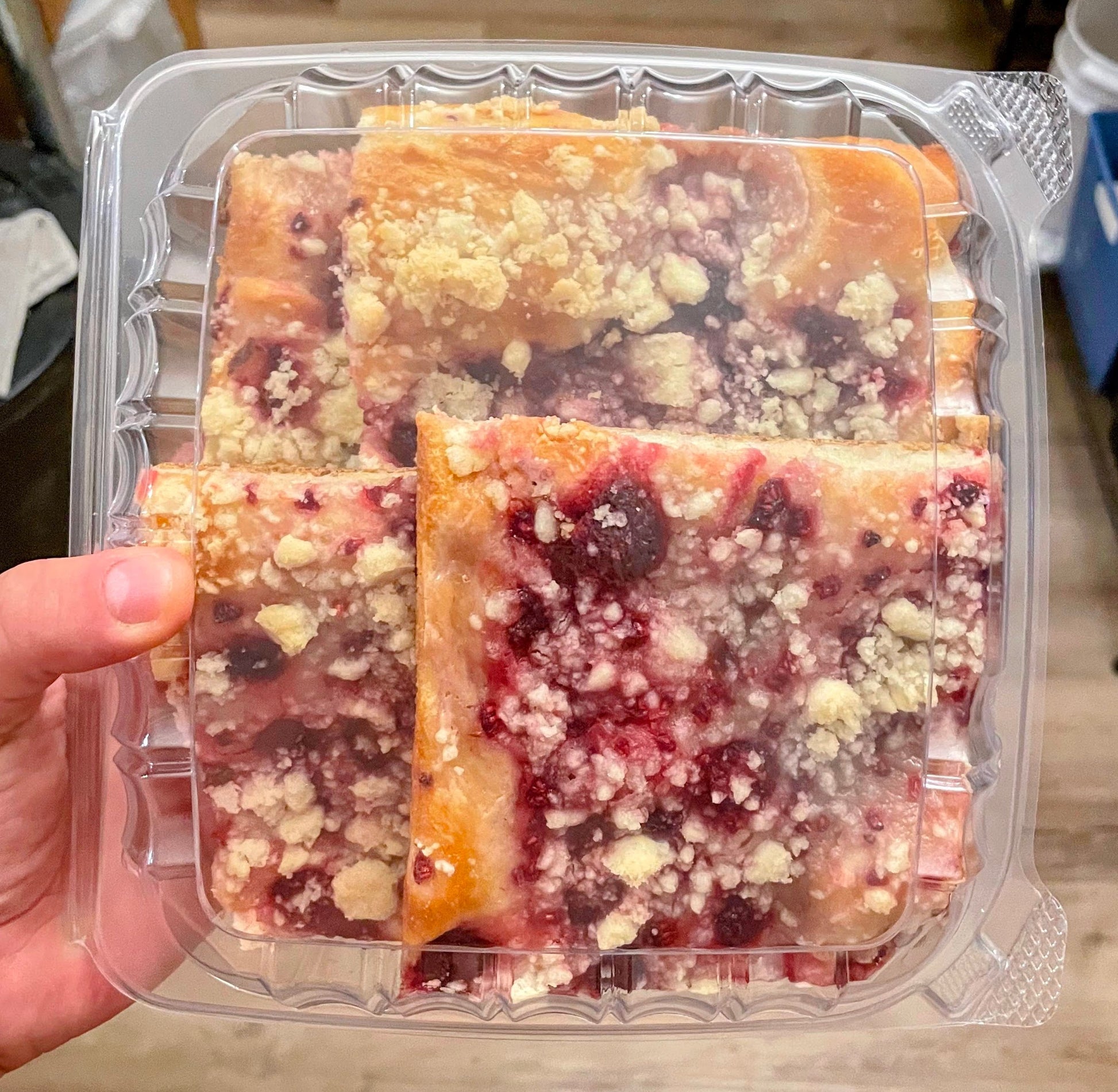 ONLY SATURDAYS - 4 pack of fluffy Sourdough Cake on the bottom and creamy & sweet Cream Cheese Raspberry swirl on top with butter Crumble!